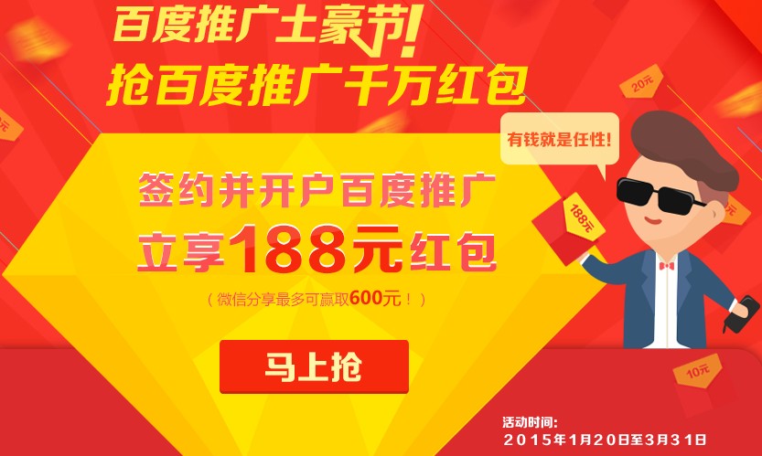 即日至2015年3月31日,提交开户百度推广申请立得188元红包,还可通过微信分享的方式给朋友们发红包,邀请好友一起做土豪!多抢多得,最高可赢取600元大红包!!!签约并开户百度推广即可兑现红包,红包限百度推广消费现金券使用!